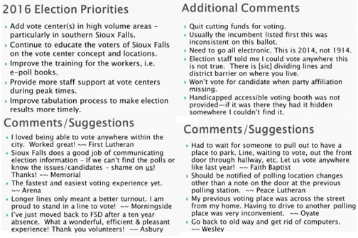 One of my favorite comments is “Quit cutting funds for voting.” When city clerk Lorie Hogstad presented this survey at the informational meeting, she mentioned that ‘saving money’ is one of their reasons for using vote centers.
