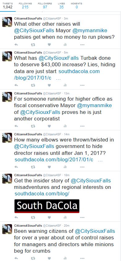 I have been warning the citizens of Sioux Falls for over a year about these out of control corporate like raises for the managers and directors while the minions beg for crumbs (SFPD). This is what it is like when you run a city like a corporation, the big dogs get all the dog food and the little guy gets a joke of a COLA.