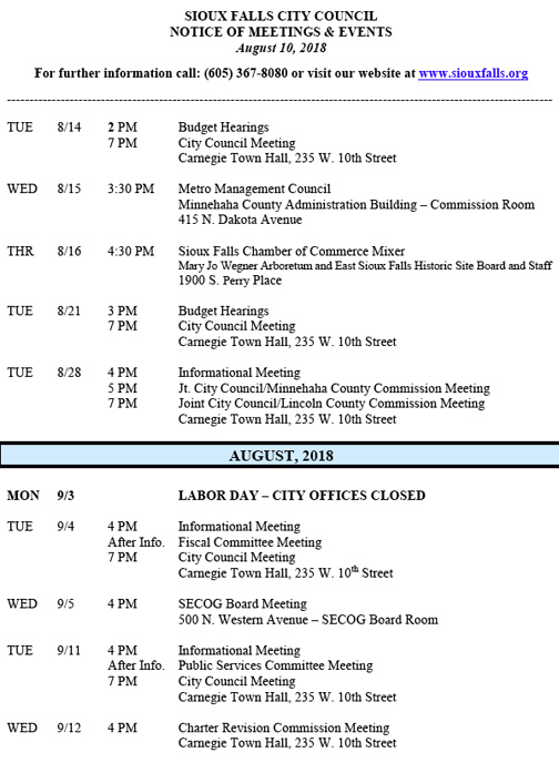 Post navigation Sioux Falls School Bond; Is it $2 a month or early payoff? Sioux Falls City Council Agenda, August 14, 2018