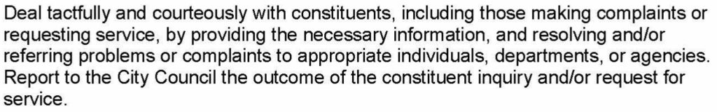 While 99% of this paragraph is spot on, I don’t think a city council staffer should be resolving any issues with constituents independently. Emotions, politics, family, etc., can be involved when constituents have complaints for their elected officials. This is NOT the job of support staff. They should gather the information and dump that request into the council’s inbox.
