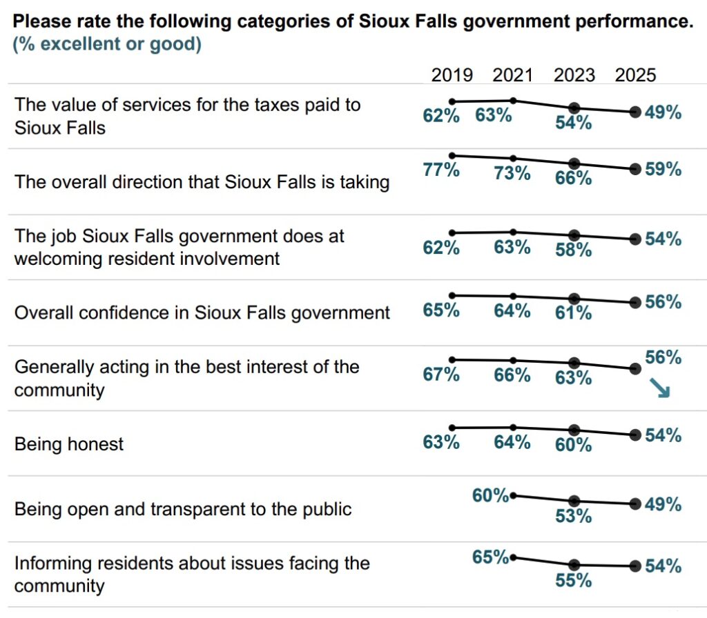 I’m sure there will be more details at the meeting today, but it will be interesting to see how the council addresses the transparency issues. I was surprised by these stats because I have been telling folks for 20 years the lack of transparency in city government and how bad it has gotten over the past 12 years but just figured no one notices because when you don’t inform people they tend to not be involved or care. If only 50% trust the government in Sioux Falls, yah got problems.