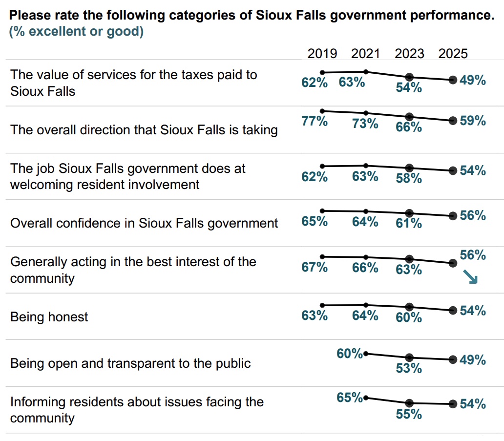 I’m sure there will be more details at the meeting today, but it will be interesting to see how the council addresses the transparency issues. I was surprised by these stats because I have been telling folks for 20 years the lack of transparency in city government and how bad it has gotten over the past 12 years but just figured no one notices because when you don’t inform people they tend to not be involved or care. If only 50% trust the government in Sioux Falls, yah got problems.