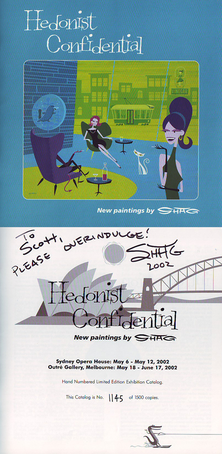 Usually my mail box is only filled with credit card offers, bills and hate mail, but today I had a pleasant surprise and had to make a critical decision. Since any decision involved a vodka tonic, it wasn’t too hard. Do I; 1) Read my new issue of Funny Times 2) Watch ‘Tales of a Rat Fink’ (Ed Roth Doc)’ 3) or Watch the Shag Doc? (Yes, I received all 3 on the same day!) I decided to watch the Shag doc. Though probably not one of the best produced or directed doc’s I have ever seen, it was chucked full of celebrities who collect his art like comedians Whoopi Goldberg and Oswald Patton. It also had several of Shag’s friends and family members, like Paul Frank (who is extremely odd). If there was anything I did not like about the DOC it was the constant praise and references to his originality. I love SHAG’s work, very cartoonish and tongue and cheek, but it is NOT original, except in the sense that NO ONE else from this ERA is doing that type of work. I will say it was refreshing to see a doc about a living breathing artist that has done well for himself, and like my hero Ed Roth, he is a Morman. Don’t worry, I won’t be converting anytime soon.