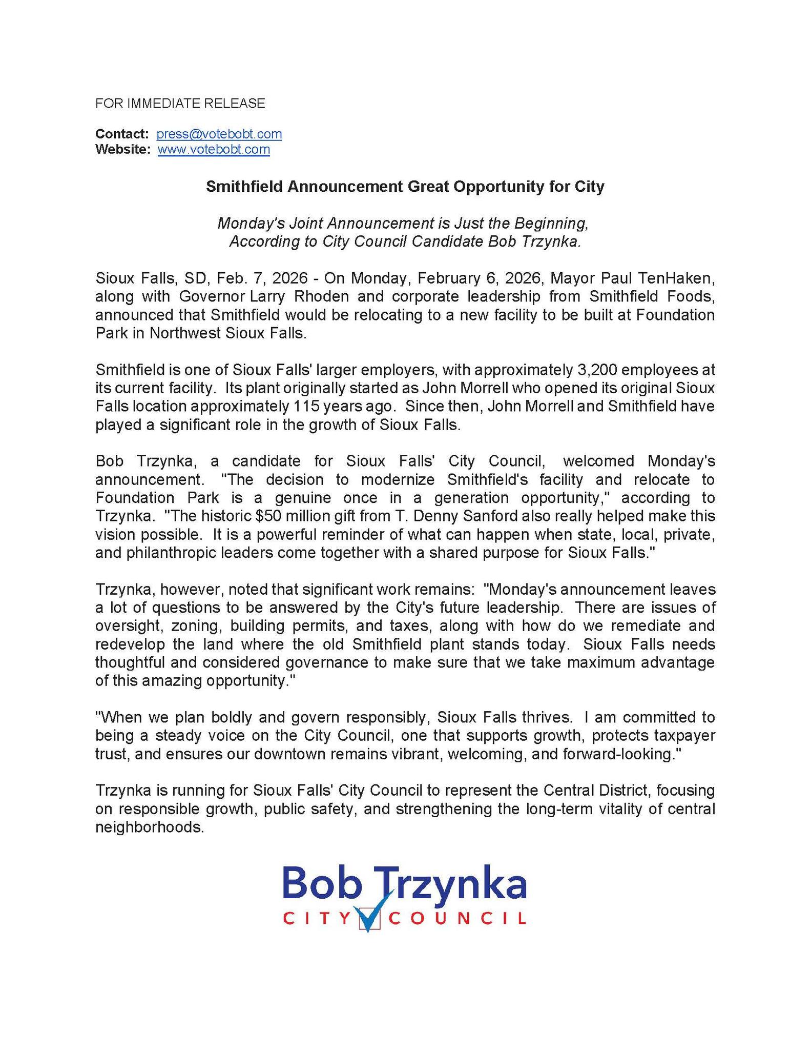 “Monday’s announcement leaves a lot of questions to be answered by the City’s future leadership. There are issues of oversight, zoning, building permits, and taxes, along with how do we remediate and redevelop the land where the old Smithfield plant stands today. Sioux Falls needs thoughtful and considered governance to make sure that we take maximum advantage of this amazing opportunity.”
