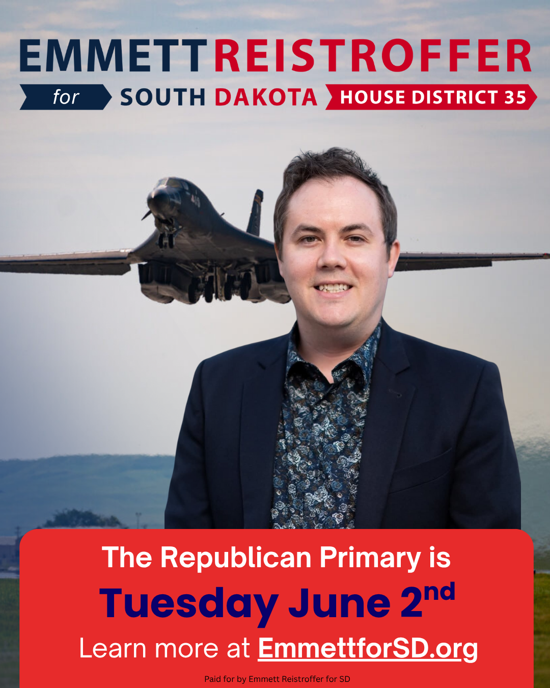 RAPID CITY, SD — Local business and public policy professional Emmett Reistroffer today announced his campaign for the South Dakota House of Representatives, District 35, running in the Republican Primary on June 2nd. Reistroffer promises straightforward, no-bull leadership that puts the people of District 35 first, prioritizing real taxpayer relief, public safety and long-term reforms to ensure fiscal responsibility and bring accountability and transparency to Pierre. “District 35 is full of brave men and women who’ve served our country and hardworking families just trying to make ends meet. I’m running for them,” said Reistroffer.
